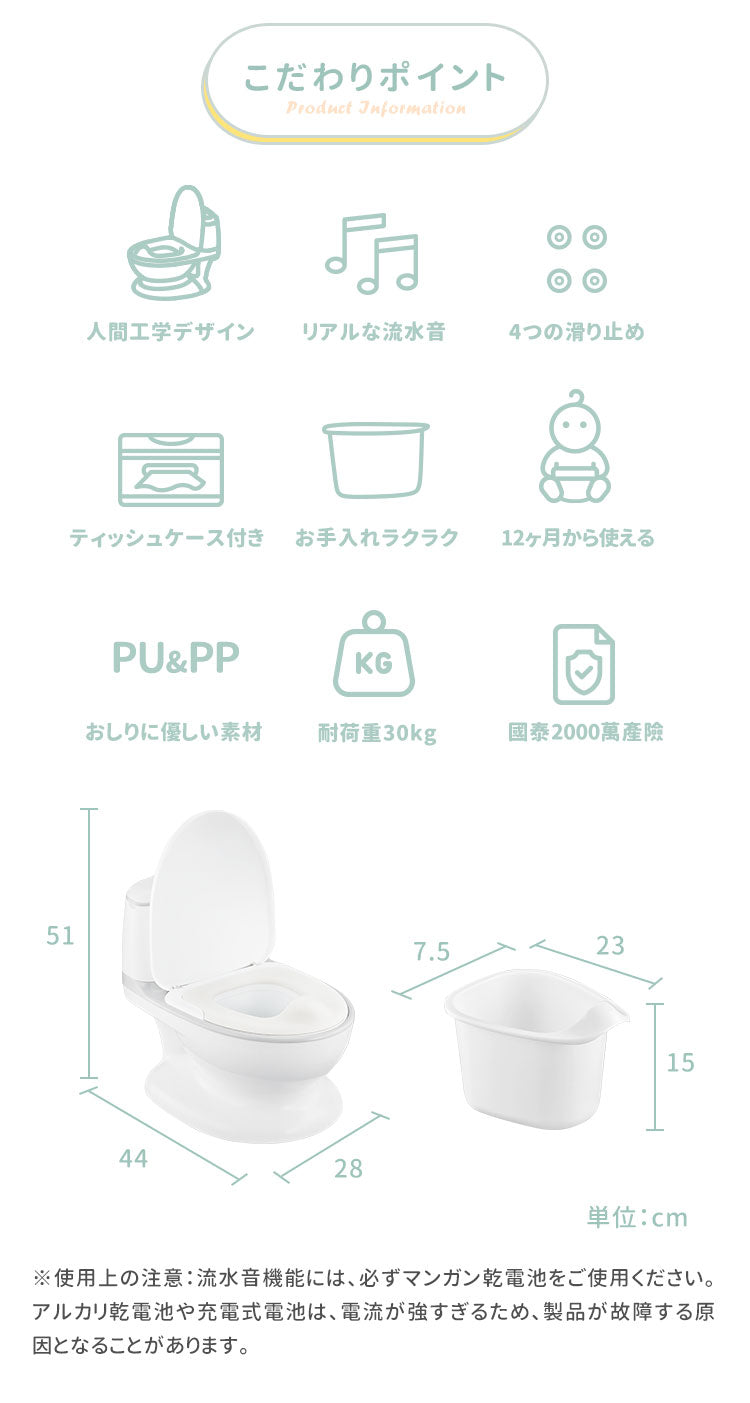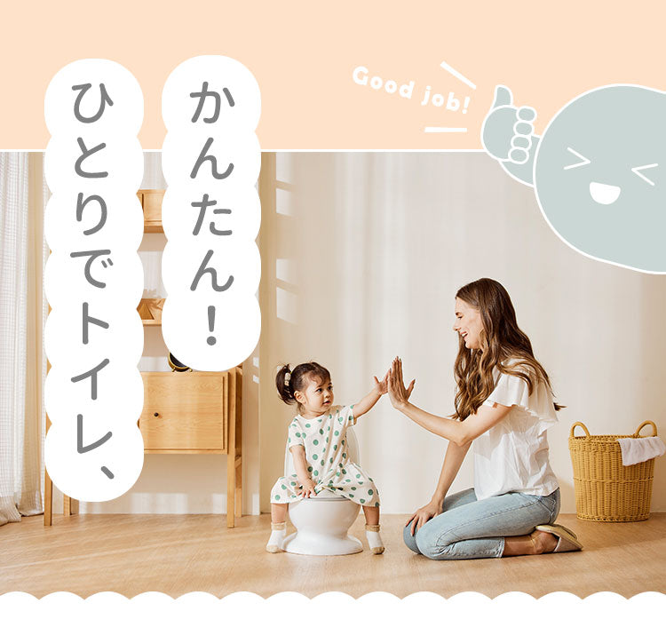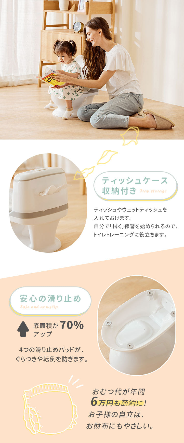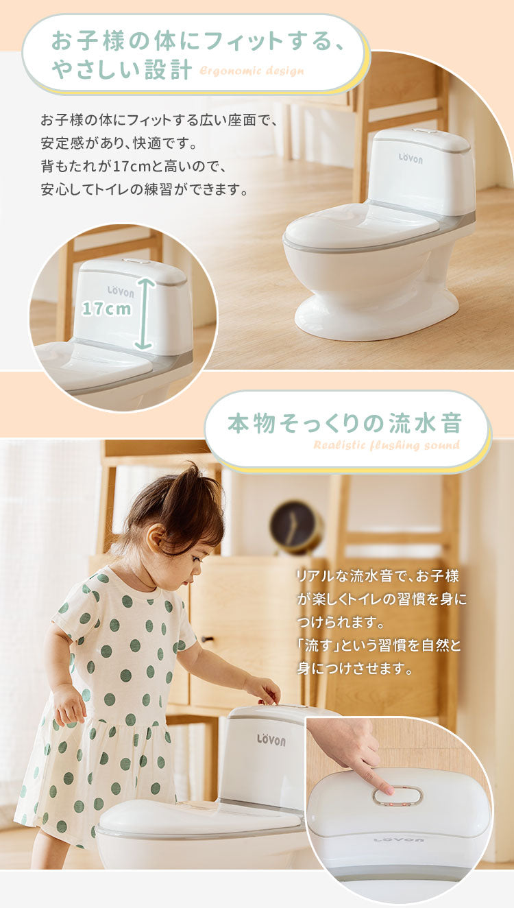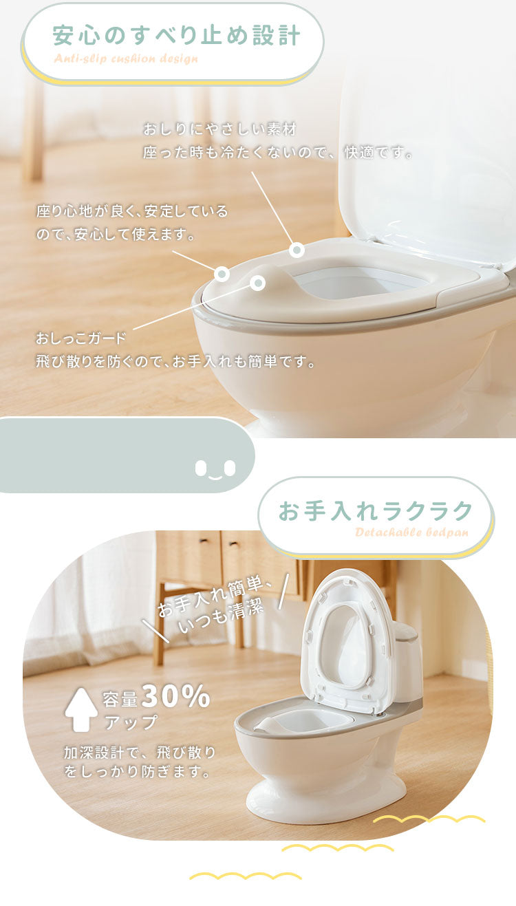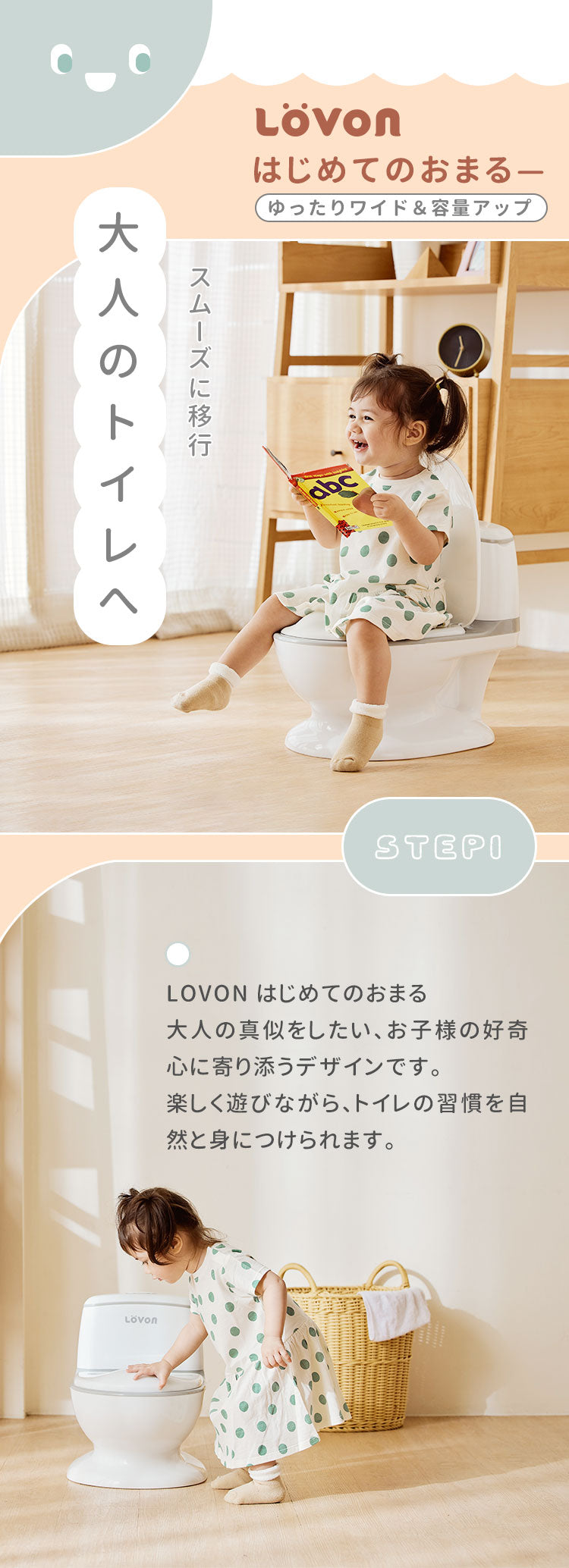 このおまるは、本物そっくりの「洋式トイレ型」で、お子さまのトイレへのスムーズな移行と自立心を育む**ことをサポートします。